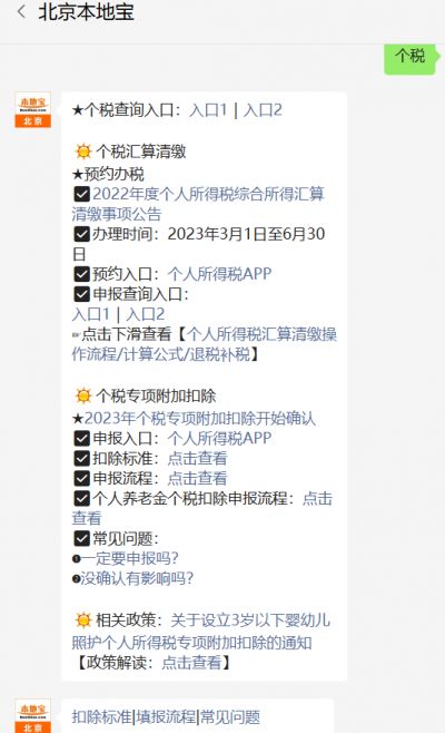 温馨提示:微信搜索公众号【北京本地宝】,关注后回复【个税】可获2022年度个人所得税汇算清缴申报时间平台/退税补税/计算公式、2023年度个税专项附加扣除确认/查询入口(APP)、扣除标准等。