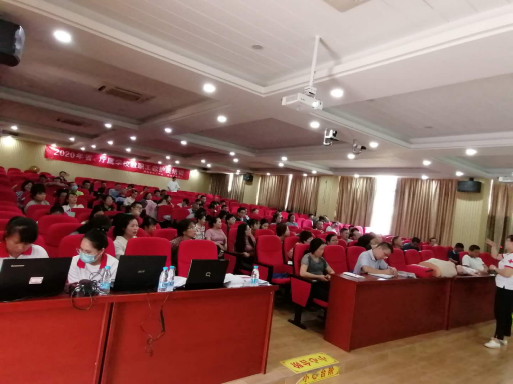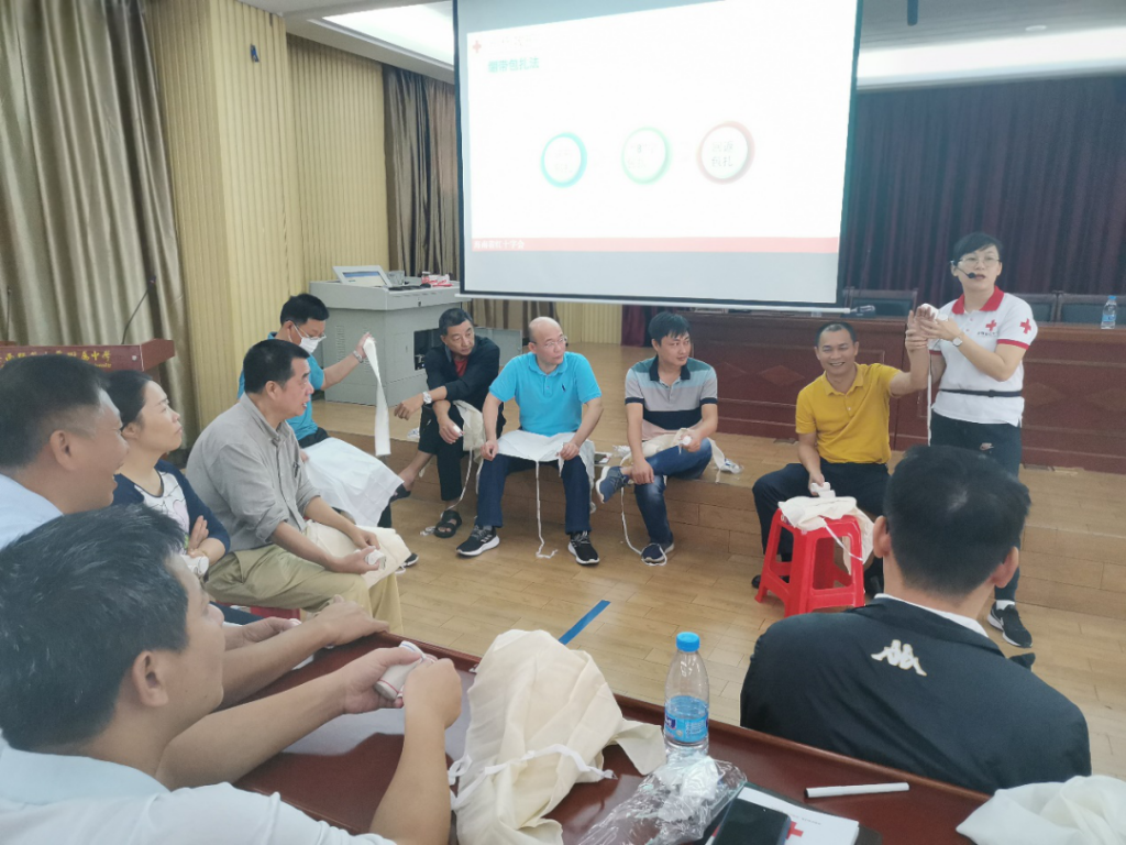 红十字救护培训老师讲解救护新概念、心肺复苏、创伤救护(止血、包扎、固定、搬运)、气道梗阻自救互救理论知识,实操环节分为八组,为各组教职工进行了心肺复苏技能和创伤救护技能练习。