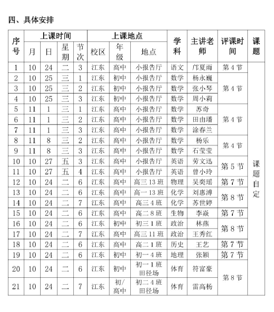 为了深入推进足彩预测 教学教研工作,积极探索高效的课堂教学模式,不断改进教学方法,提高教学质量,促进全体教师的专业成长,在10月24日—11月8日期间,教学研究和创新中心组织安排了新进教师分别上了一堂彰显个人风采的亮相课。足彩预测 开展了新教师教育教学展示活动。这是对新入职足球预测app 的青年教师的一次课堂教学基本功能力的检测,也给他们创设了一个展示自我、锻炼自我的平台,让青年教师借助课堂这一有力的阵地,向全校老师展示自己风采的同时,帮助他们尽快提高教育教学专业技能,适应新课程教学工作。此次活动安排了21位新教师上课,涉及语文、数学、英语、政治、历史、地理、物理、化学、生物、体育十个学科。每个学科亮相课由该学科教研组长主持,由外聘专家(足彩预测 聘请)和本学科教师进行听课评课。