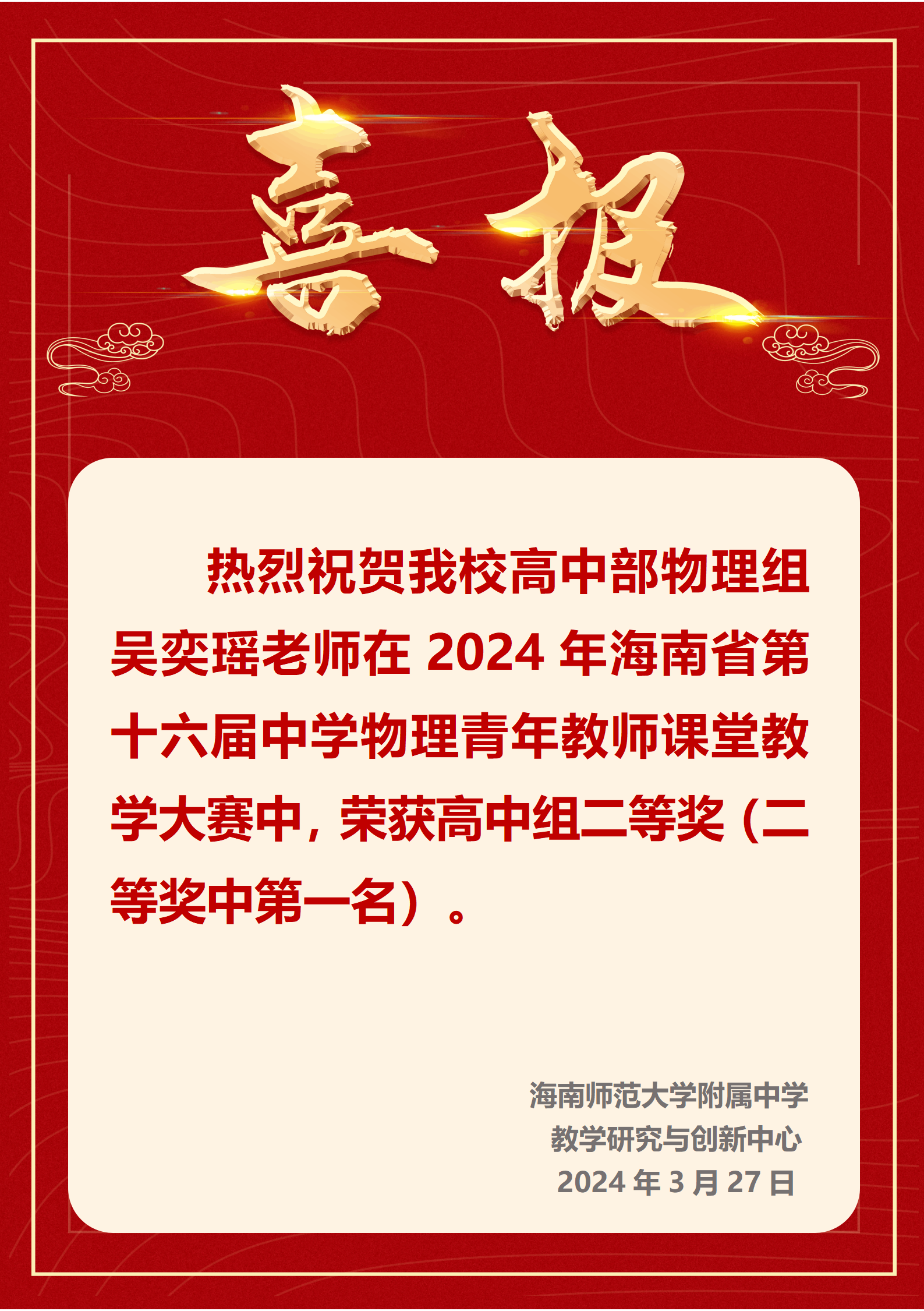 祝贺吴奕瑶老师荣获海南省第十六届中学物理青年教师课堂教学大赛高中组二等奖
