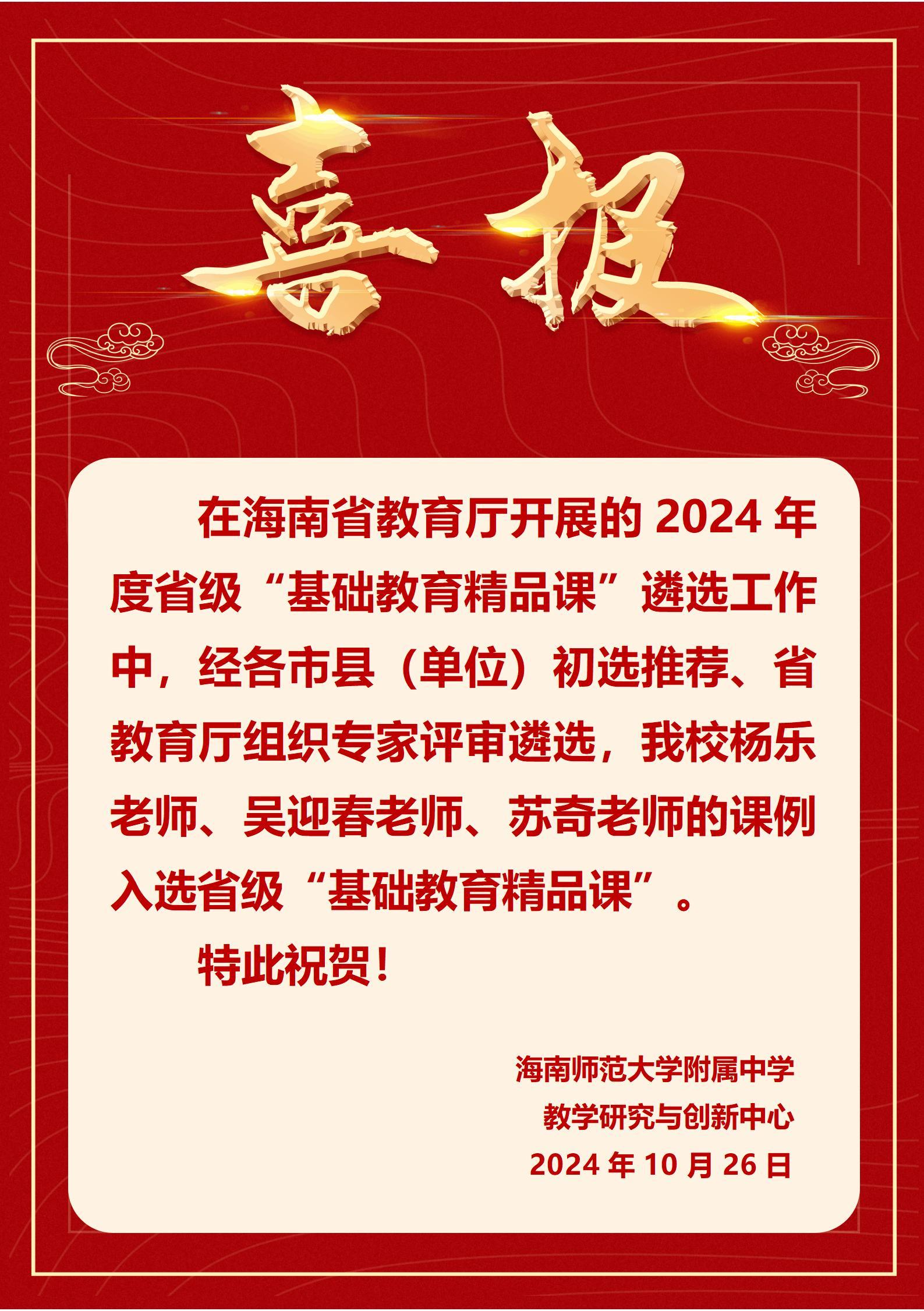 祝贺足球预测app 杨乐、吴迎春、苏奇老师的课例荣获2024年度海南省“基础教育精品课”